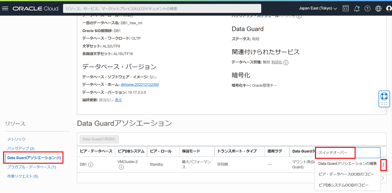 プライマリ・データベースのリージョン(本ガイドでは、東京リージョン)のデータベース詳細のリソースの一覧からData Guardアソシエーションをクリックし、アクション・ボタンをクリックし、スイッチオーバーをクリックします。