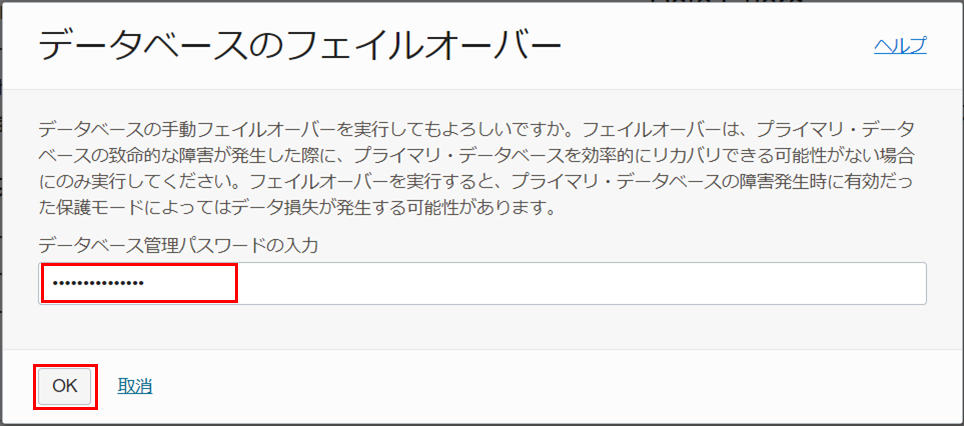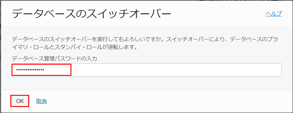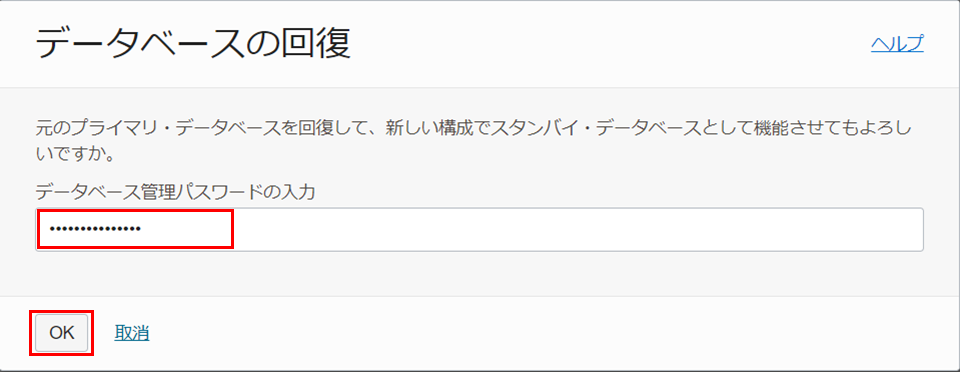 データベース管理パスワードを入力し、OKボタンをクリックします。プライマリ・データベースの管理パスワードとスタンバイ・データベース管理パスワードは同じパスワードが設定されています。