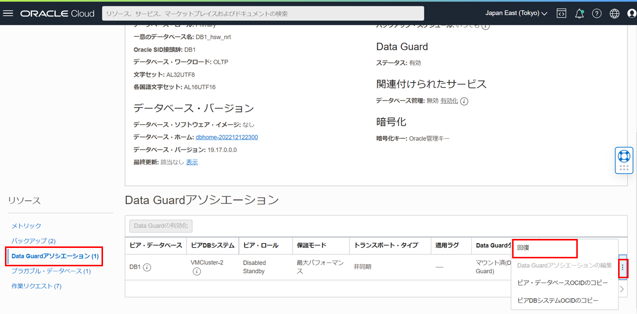 プライマリ・データベースのリージョン(本ガイドでは東京リージョン)のデータベース詳細のリソースの一覧からData Guardアソシエーションをクリックし、アクション・ボタンをクリックし、回復をクリックします。