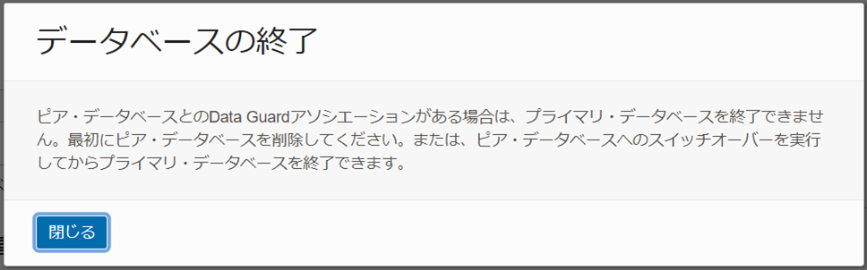 Data Guardアソシエーションに含まれるデータベースもしくはDBシステムを削除する場合、最初にスタンバイ・データベース(DBシステム)を削除しましょう。スタンバイ・データベースが紐づけられている状態の時に、プライマリ・データベースを削除しようとするとエラーが表示され、削除できません。もし、プライマリ・データベースの環境のみを削除したい場合には、一度ロールを切り替えて削除対象の環境をスタンバイ・ロールにしてから削除という形をとって頂ければと思います。