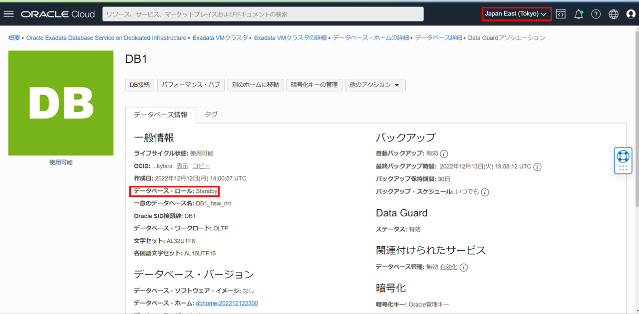 データベースの状態が使用可能になるとプライマリ・データベース(本ガイドでは、東京リージョン)とスタンバイ・データベース(本ガイドでは、大阪リージョン)のそれぞれのデータベース・ロールが切り替わります。
