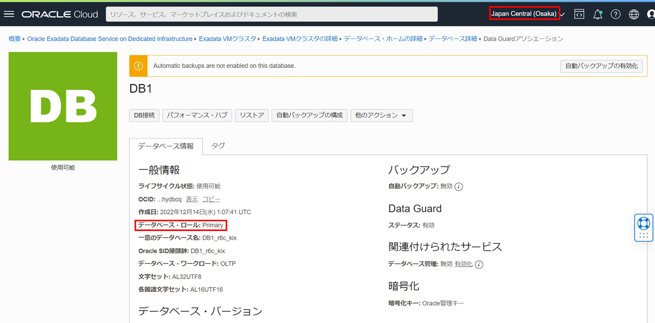 旧スタンバイ・データベース(本ガイドでは、大阪リージョン)のデータベース・ロールがPrimaryに切り替わっている