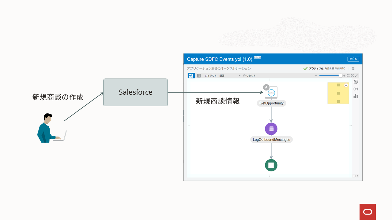 このチュートリアルは、Salesforce(SFDC)側で新規商談(Opportunity)が登録されたら、SFDCのアウトバウンドメッセージが送信され、OIC の統合が起動される一連の動作を確認します。