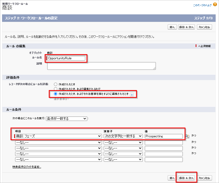 ここでは、SFDCにて新規商談(Opportunity)が フェーズ=Prospecting で作成時に起動されるワークフロールールを作成します。