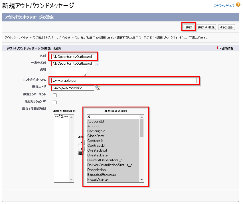 新規アウトバウンドメッセージの作成画面が開きます。以下を入力し、「保存」 をクリックします。