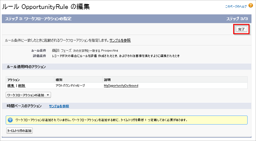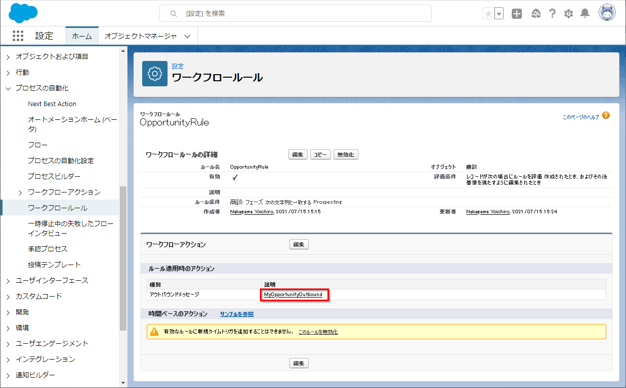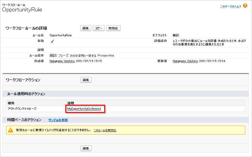 SFDC の設定画面を開き、作成したワークフロールール(OpportunityRule)を開きます。