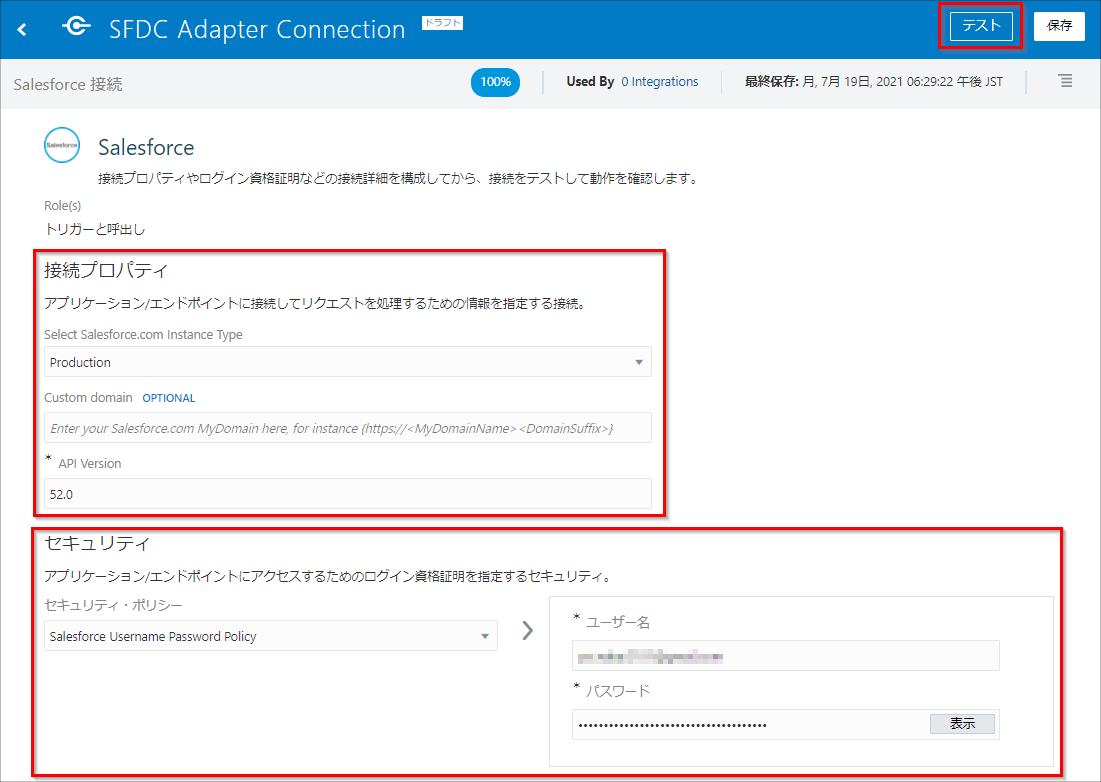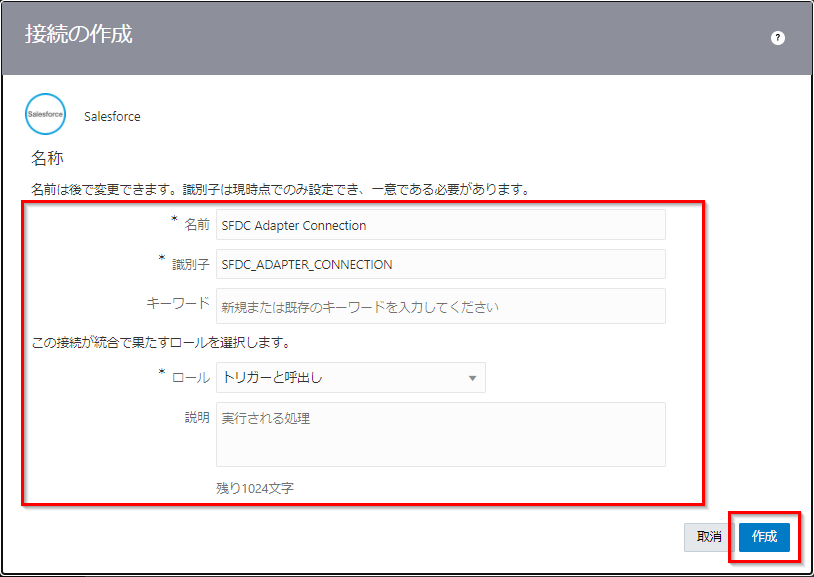 OICに事前定義されたSFDCアダプタを利用して、SFDC接続を作成します。