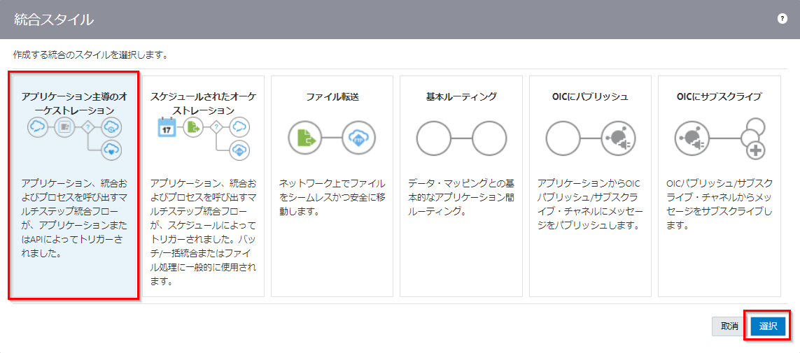 「統合スタイルの選択」より、「アプリケーション主導のオーケストレーション」 を選択し、「選択」 をクリックします。