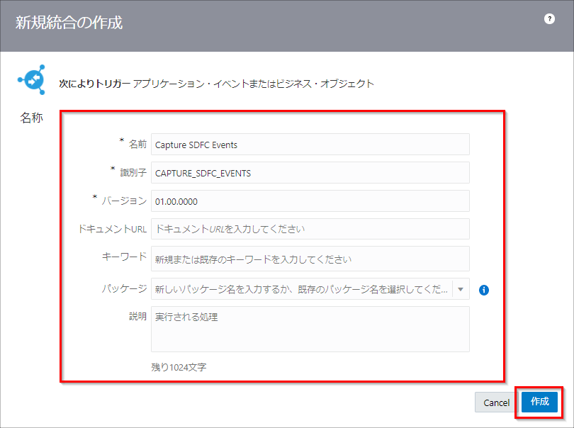 名前に 「Capture SDFC Events」 を入力します。その他の項目は未入力のままで、「作成」 をクリックします。