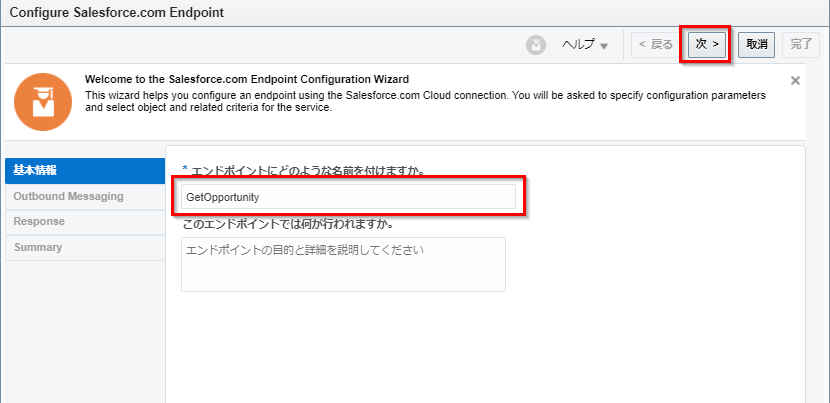 エンドポイントの名前に GetOpportunity と入力し、「次 >」 をクリックします。
