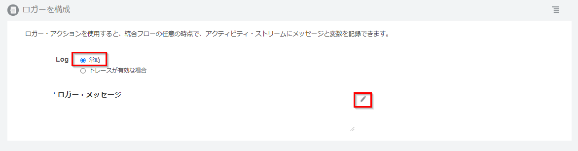 Logで 「常時」 を選択し、ロガー・メッセージの 編集アイコン をクリックします。