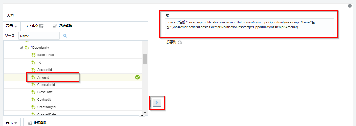 同じ手順で、concat 関数の第3引数に “金額:” を、第4引数に notifications → Notification → Opportunity → Amount を入力します。式の記述は以下の通りとなります。