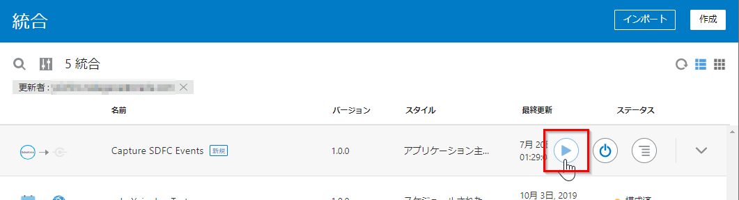 作成した Capture SFDC Events の上にマウスカーソルを合わせて、「実行」 をクリックします。