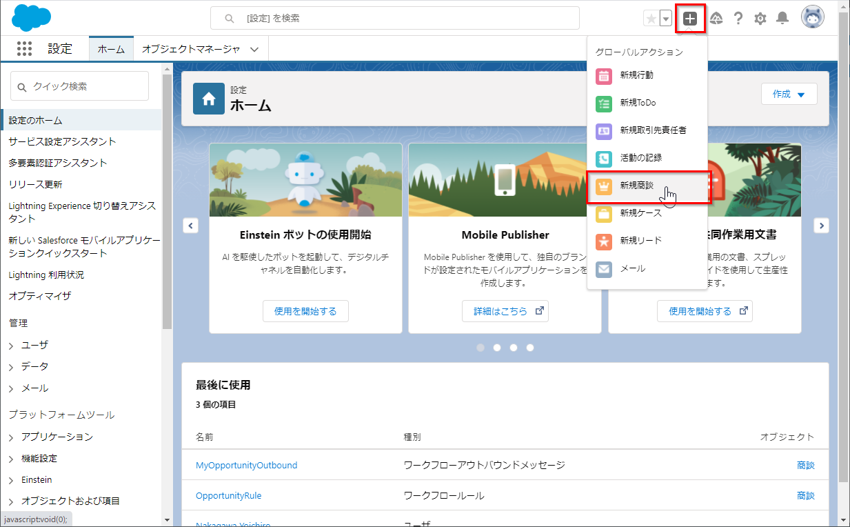 SFDC のセールス画面で右上にある「+」から「新規商談」を開きます。