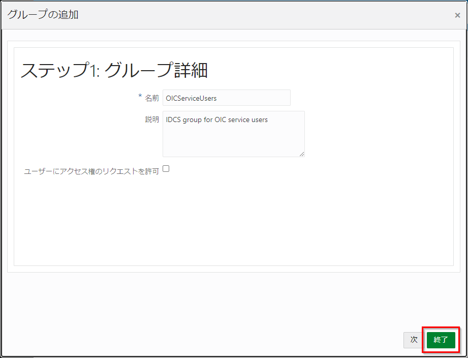 名前と説明を入力し、終了をクリックします。ここではは以下を入力します 名前: OICServiceUsers 説明: IDCS group for OIC service users