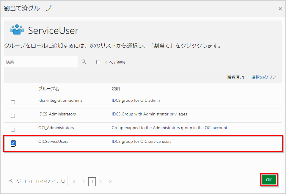 ロールに割り当てるグループを選択し、OKをクリックします。 ここでは、OICServiceUsers を選択します