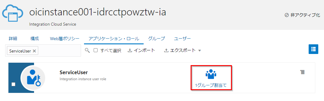 作成したIDCSグループ(OICServiceUsers)を、OIC の事前定義済ロール ServiceUser に割り当てます