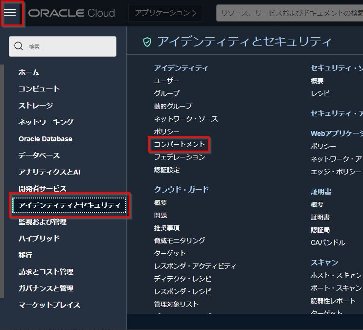 ハンバーガーメニューの"アイデンティティとセキュリティ"⇒“コンパートメント"をクリックします。