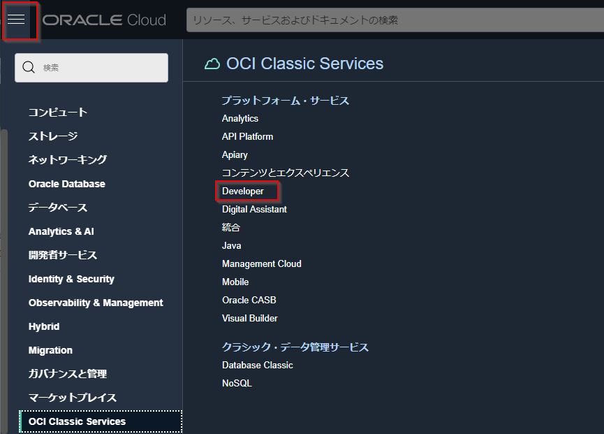 左上のハンバーガーメニューをクリックし、“OCI Classic Services”⇒“Developer"をクリックします。