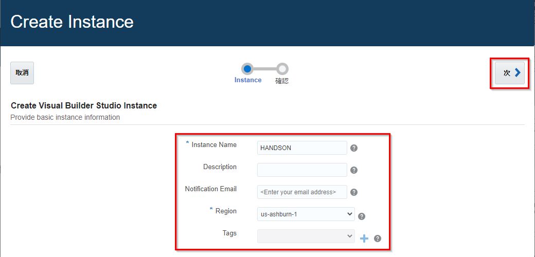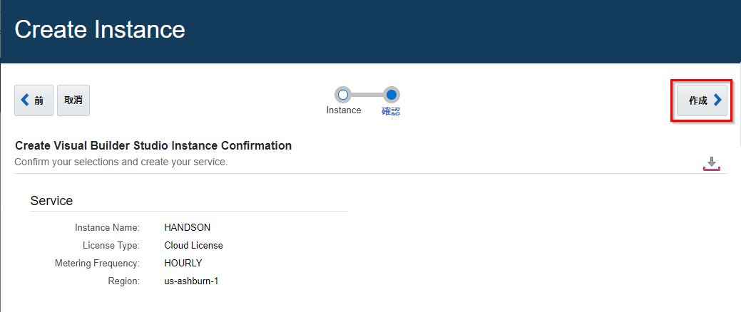 | Instance Name | Visual Builder Studioのインスタンス名。今回は"Handson” |