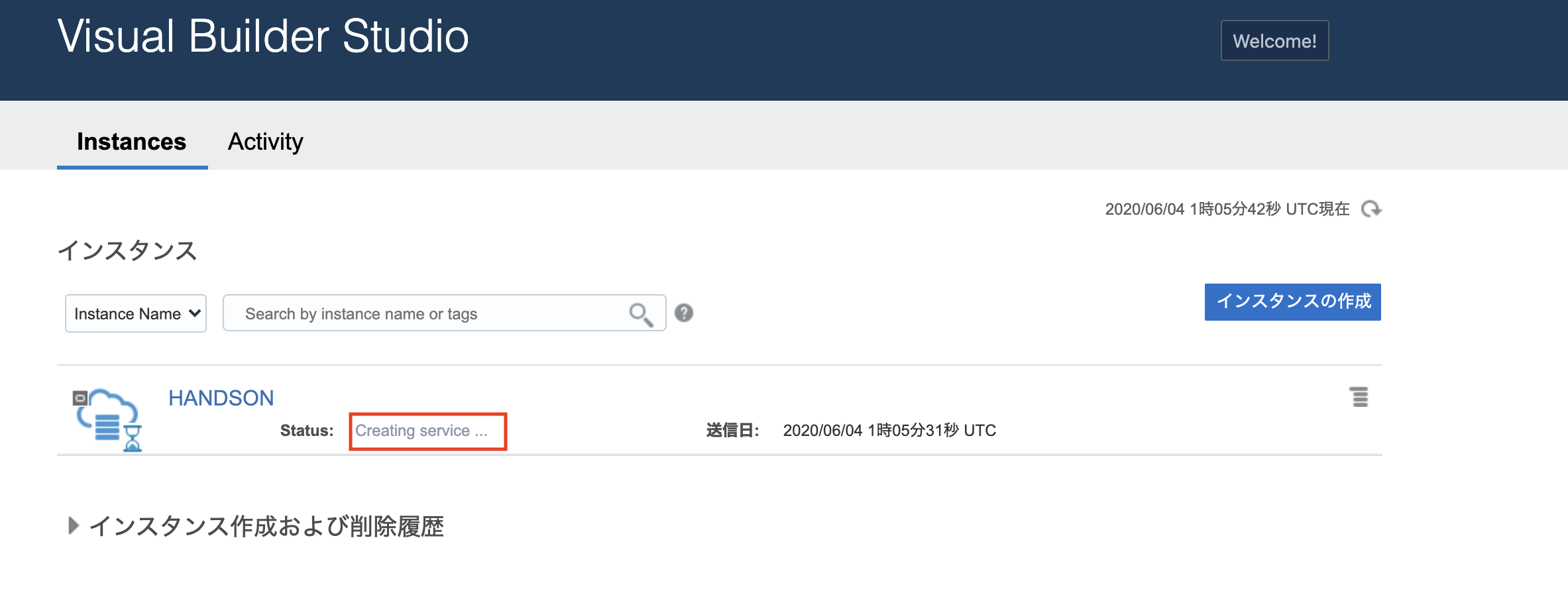 インスタンス作成がリクエストされます。Statusが"Creating service"になっていることを確認します。