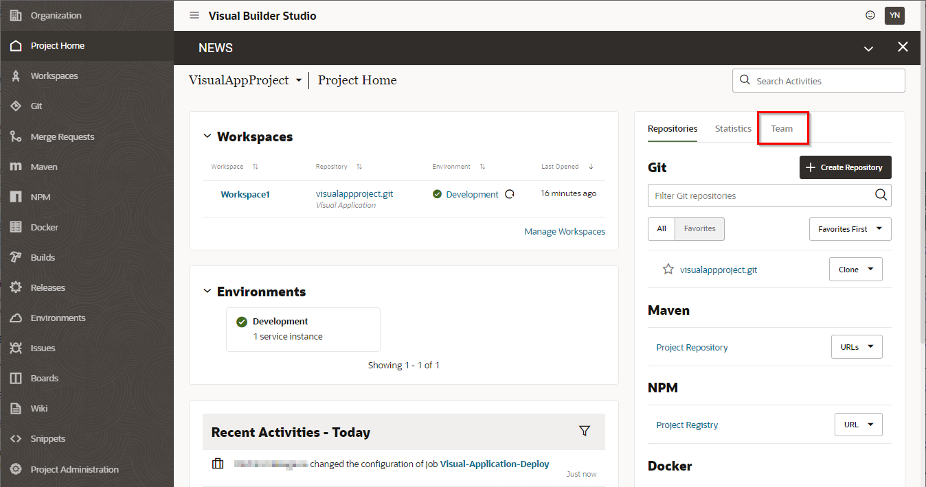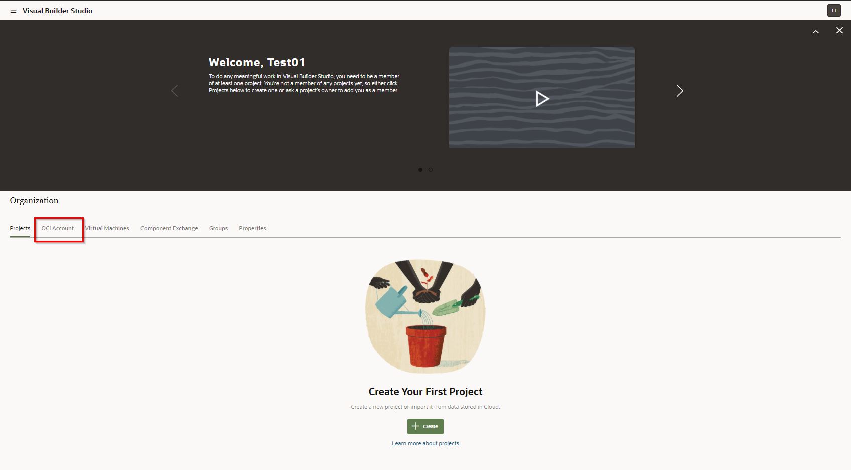 Visual Builder Studioのメニューが表示されます。最初にVisual Builder Studioを利用するにあたって必要な情報を入力する必要があります。