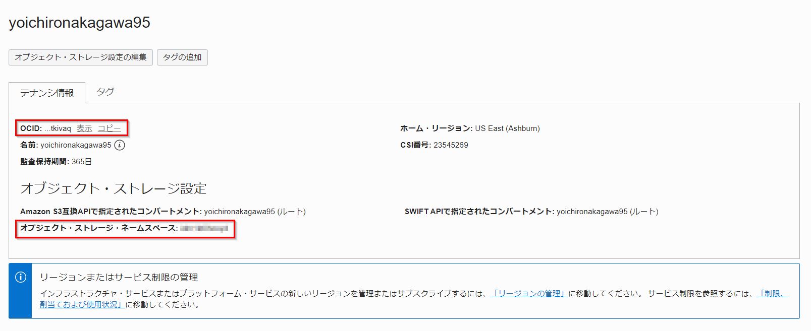 - オブジェクト・ストレージ・ネームスペース:オブジェクト・ストレージ・ネームスペース