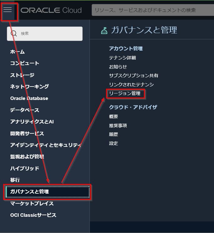 OCIコンソール左上のハンバーガーメニューを展開し、“ガバナンスと管理”⇒“リージョン管理"に移動します。