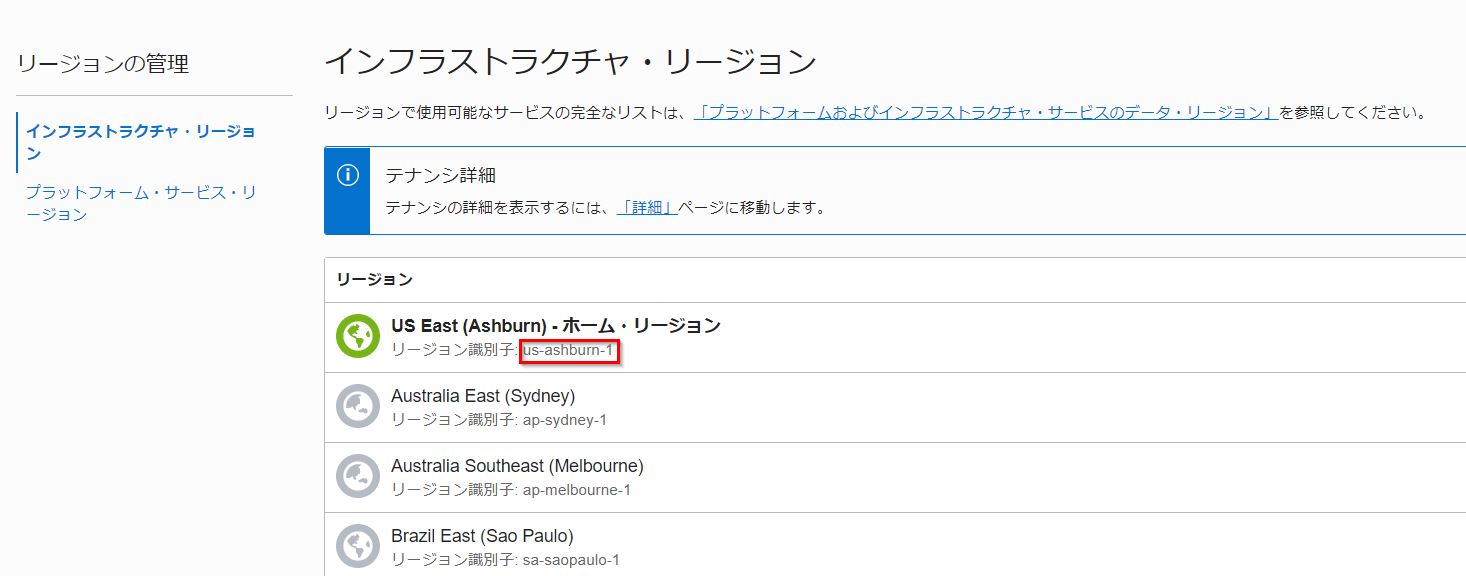 USにあるデータセンター"US East (Ashburn)“を使用する場合"us-ashburn-1"になります。