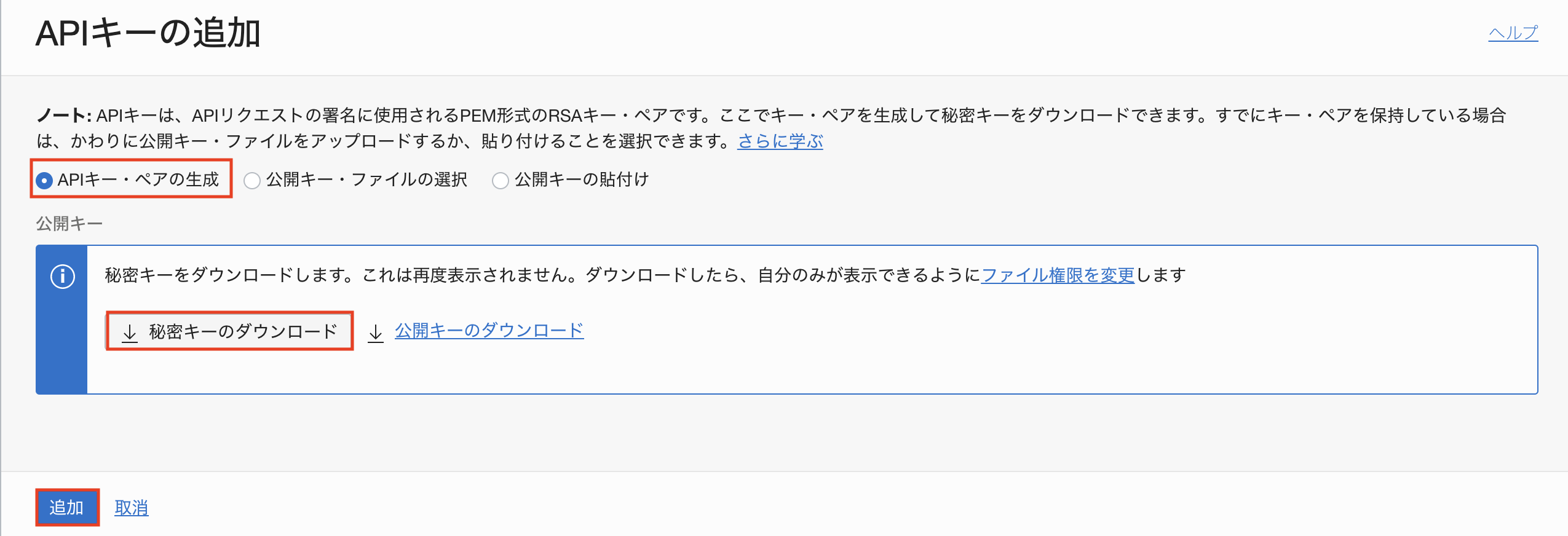 今回は、“APIキー・ペアの生成"にチェックし、“秘密鍵のダウンロード"をクリックし、API秘密鍵をダウンロード後に"追加"ボタンをクリックします。