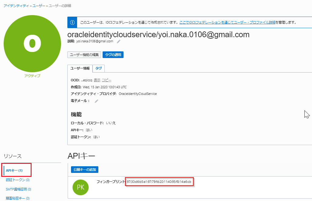 API Signingキーのフィンガープリントは6.APIキーの取得の手順により、ユーザー詳細画面から確認できるようになっています。