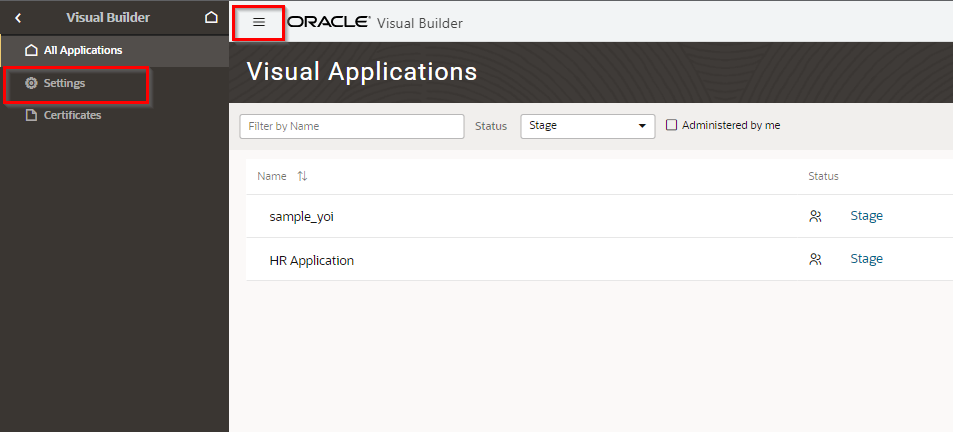VBCSのコンソール画面を開き、左上のメニューから"Setting"を開きます。