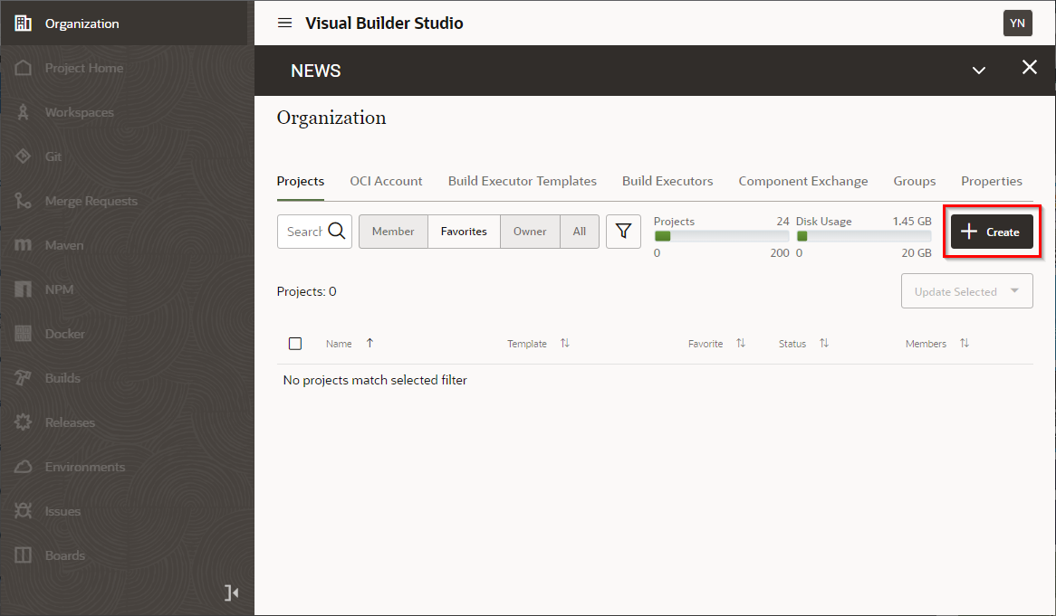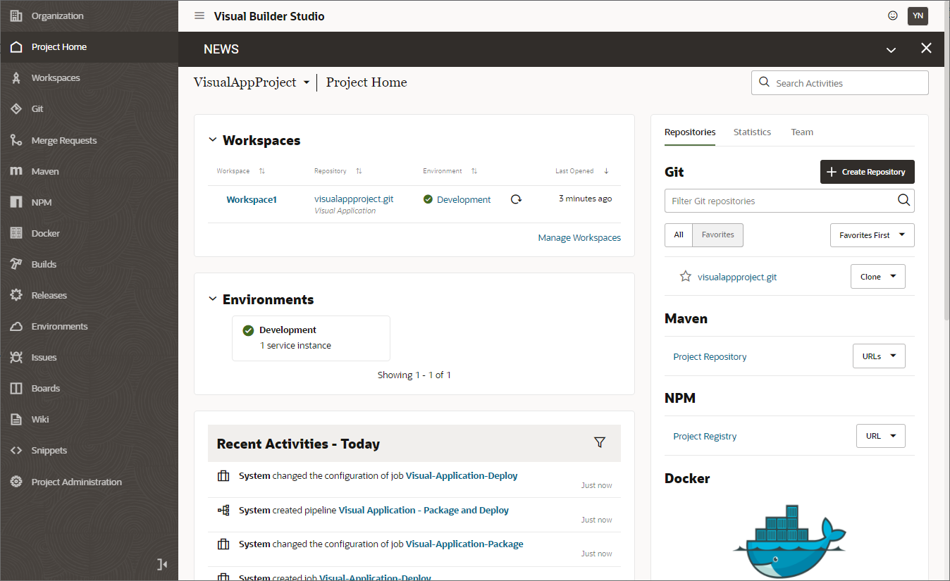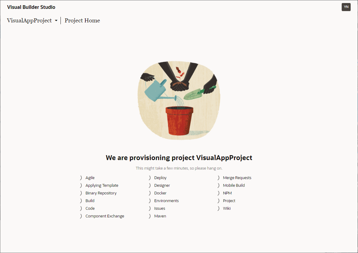 以下のように画面が表示されれば、Visual Builder Studioのセットアップが完了です。