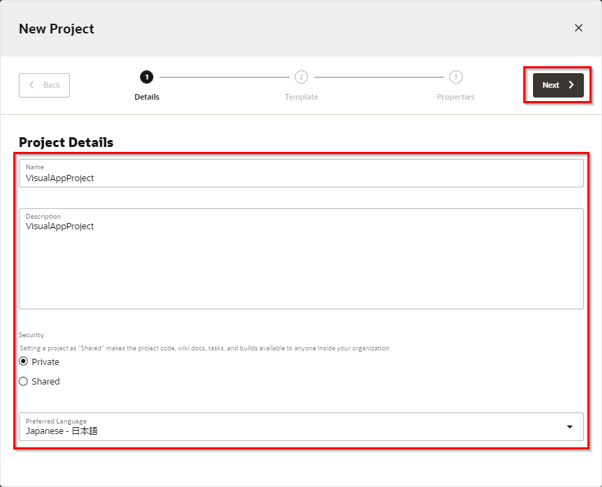 Visual Builder Studioを利用するために必要な情報を入力していきます。