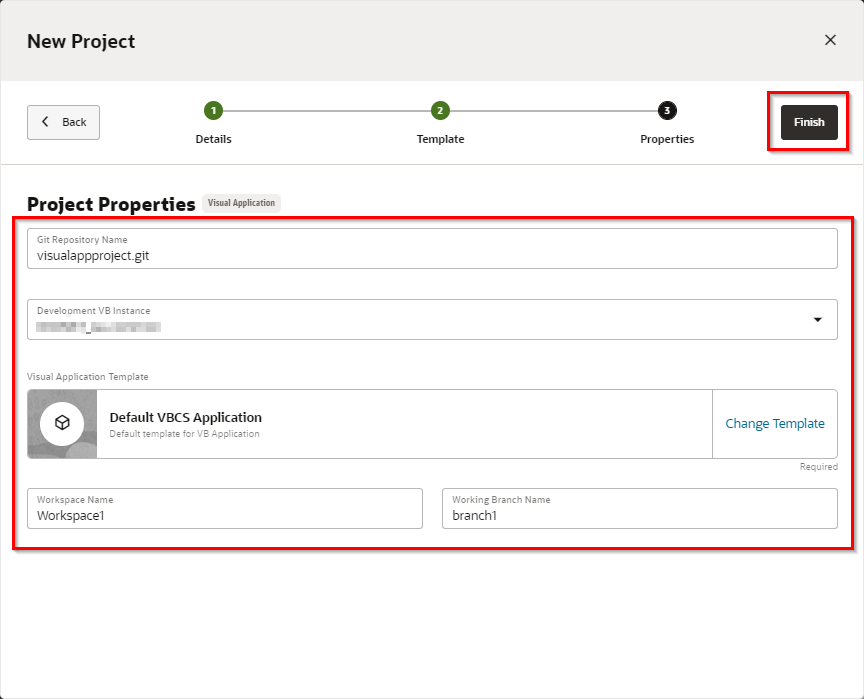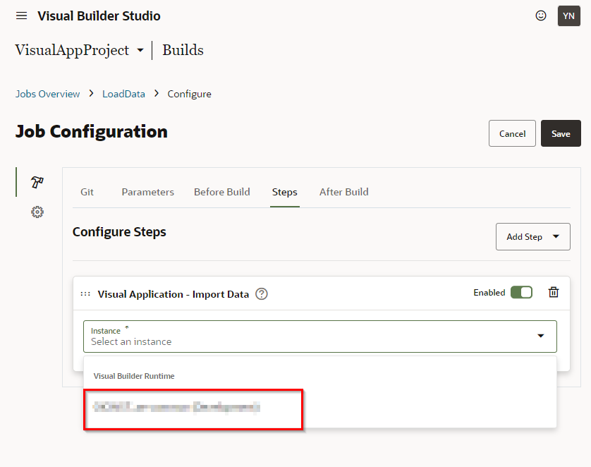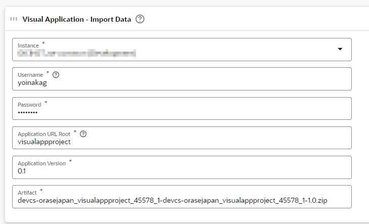 “Visual Application"のStepで利用しているVBCSインスタンスを設定します。