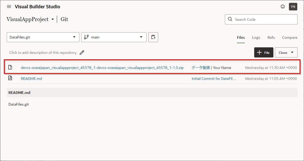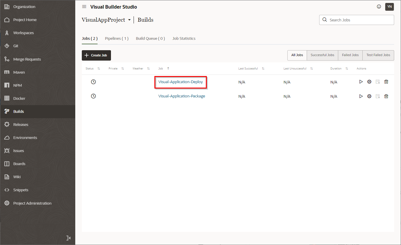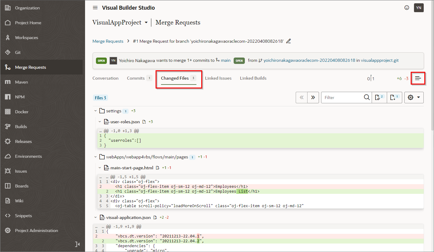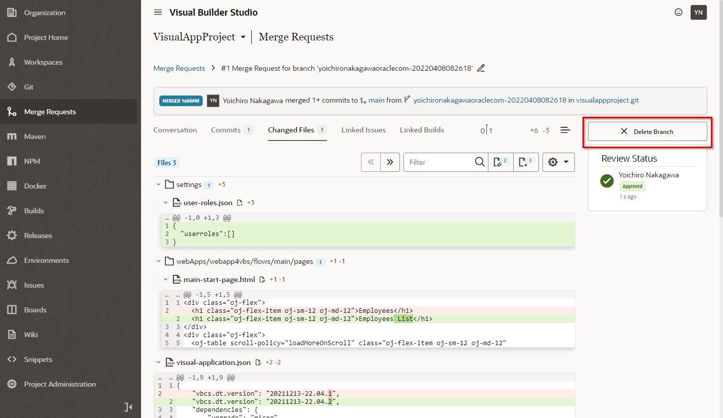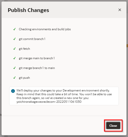 “Publish Changes” をクリックすると自身のブランチのリソースがmainブランチへマージされ、自動的にVisual Builder Studioのビルドジョブが実行されます。ビルドジョブが実行されると本番環境へ作成したビジュアル・アプリケーションがデプロイされます。