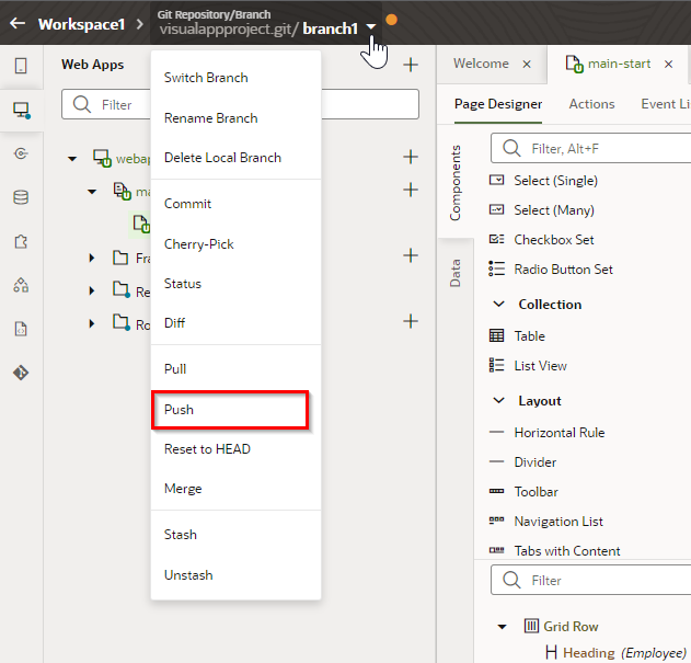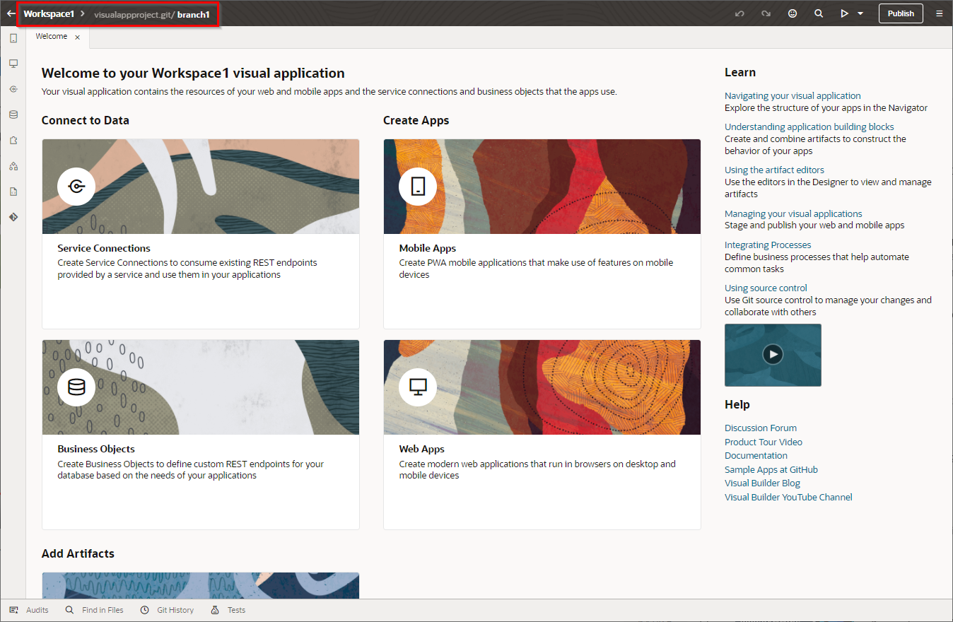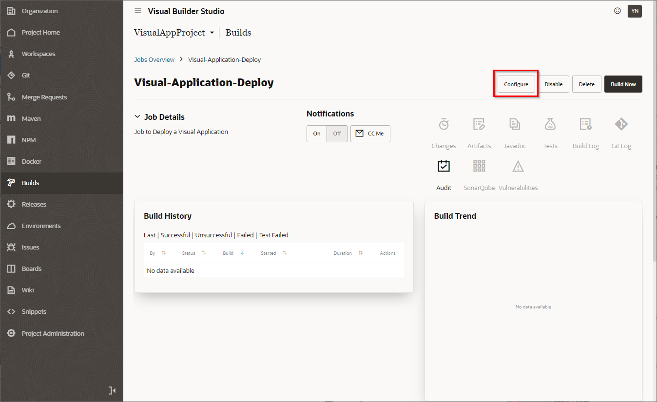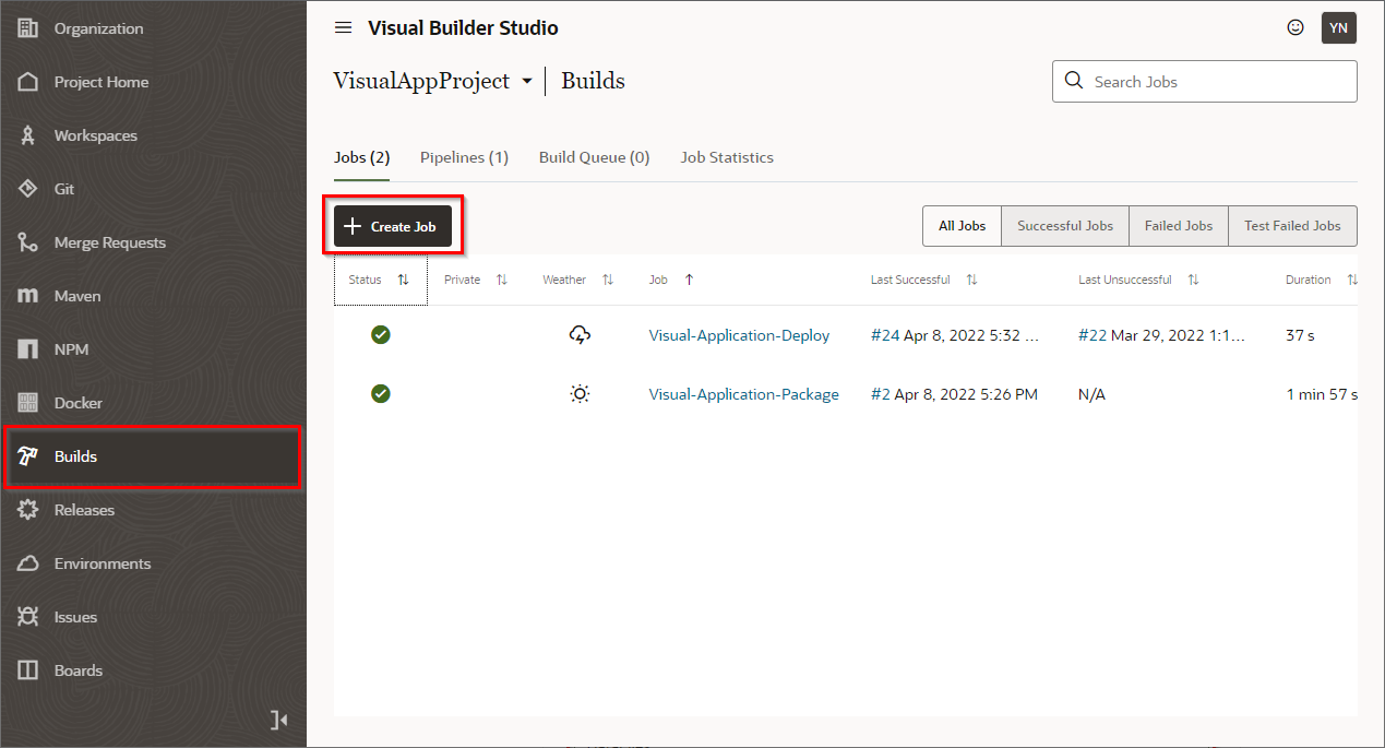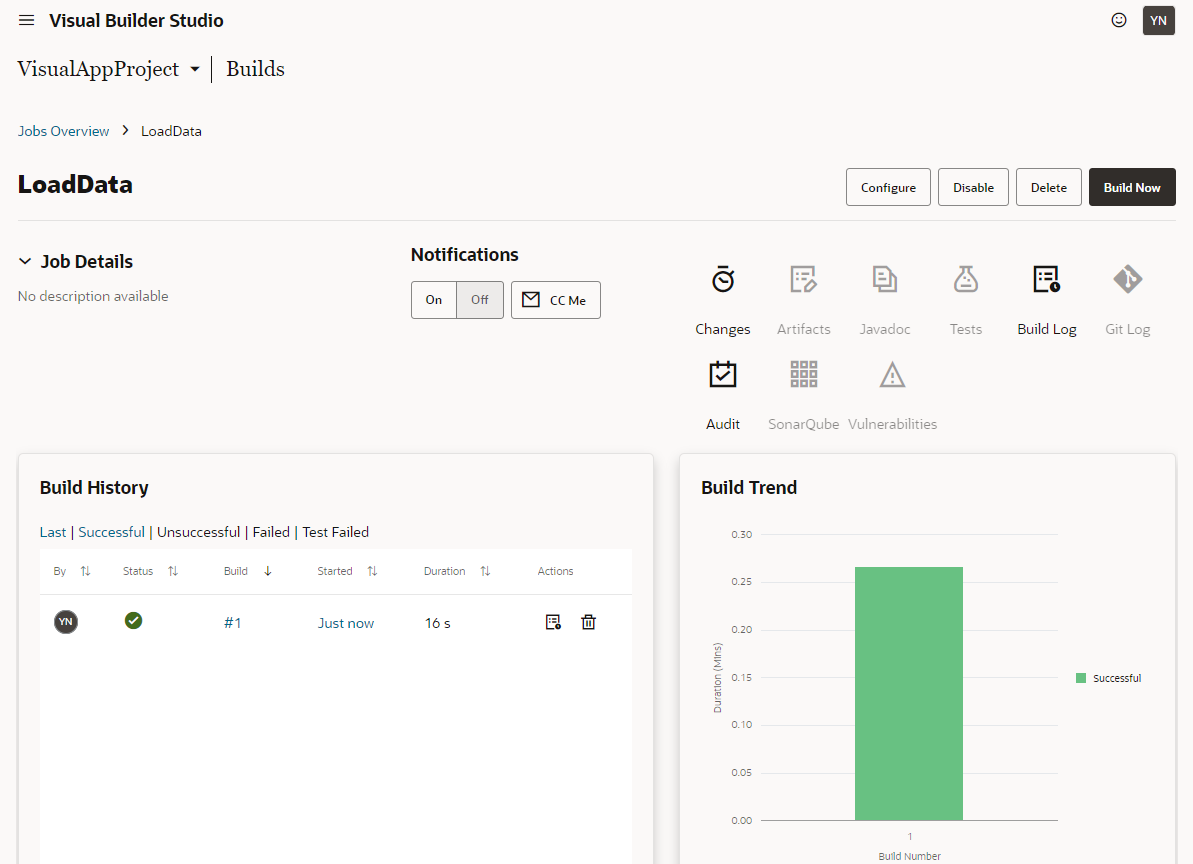 “Publish Changes” をクリックすると自身のブランチのリソースがmainブランチへマージされ、自動的にVisual Builder Studioのビルドジョブが実行されます。ビルドジョブが実行されると本番環境へ作成したビジュアル・アプリケーションがデプロイされます。