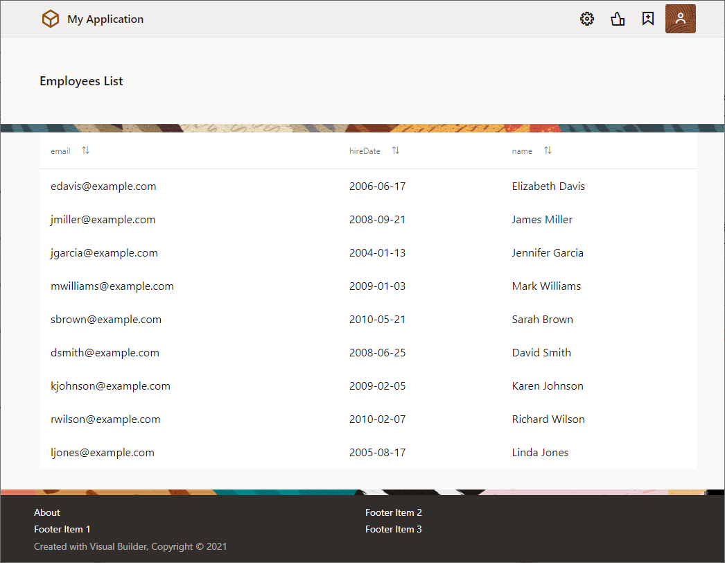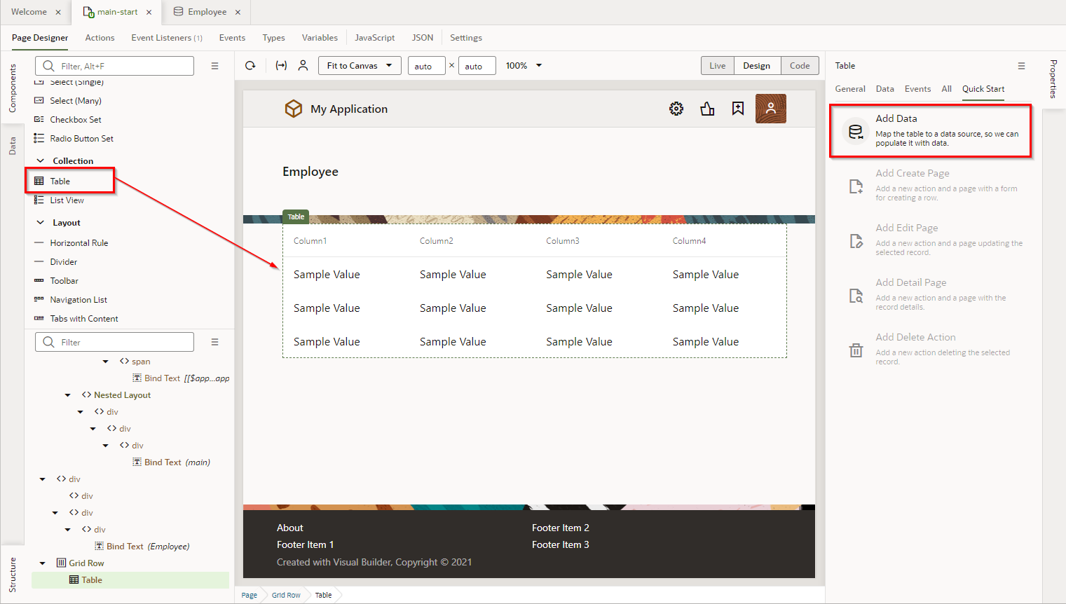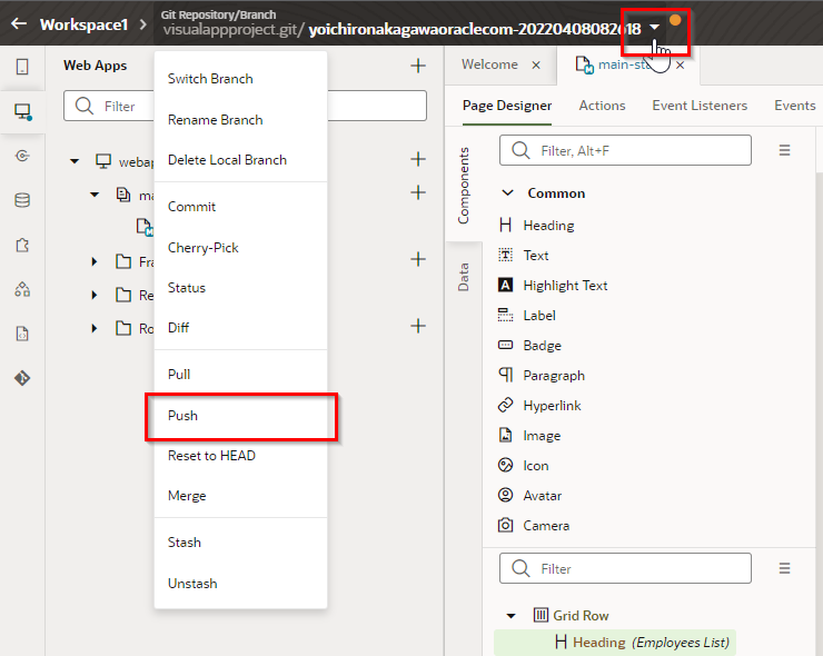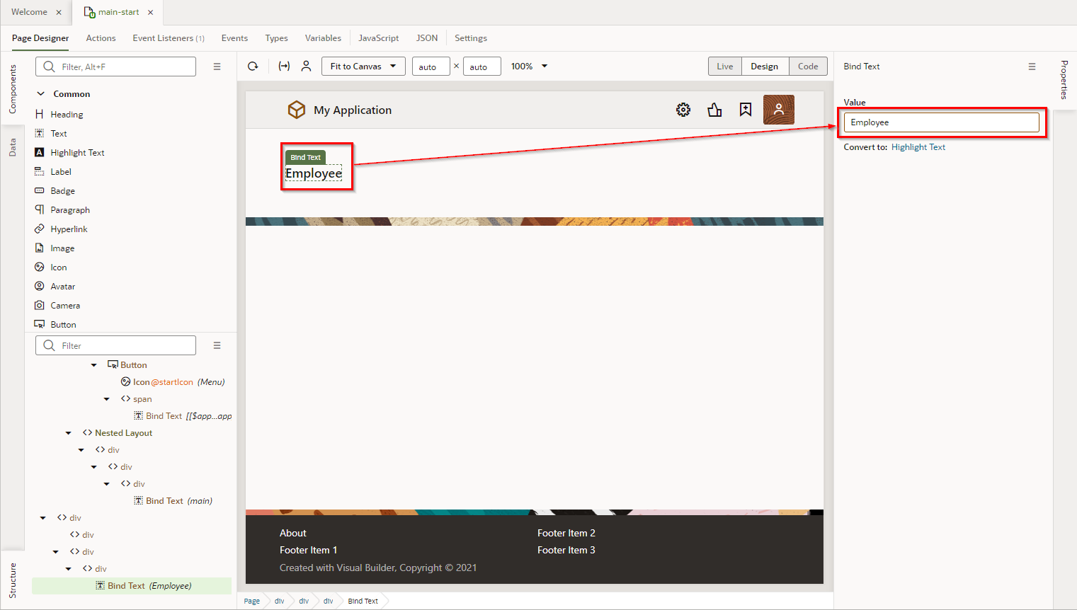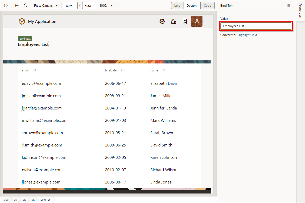 VBCSのコンソール画面へ遷移し、“Page Designer"から画面の任意の場所を編集します。今回はタイトルを"Employees"から"Employees List"へ変更します。