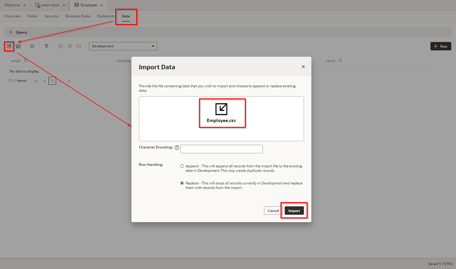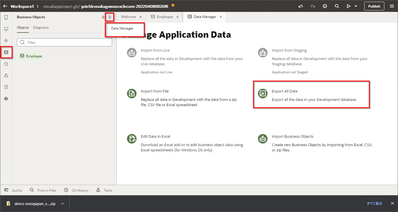 VBCSの画面からビジネス・オブジェクトを開き、メニュー-Data Managerから"Export All Data"をクリックし、全データをダウンロードします。