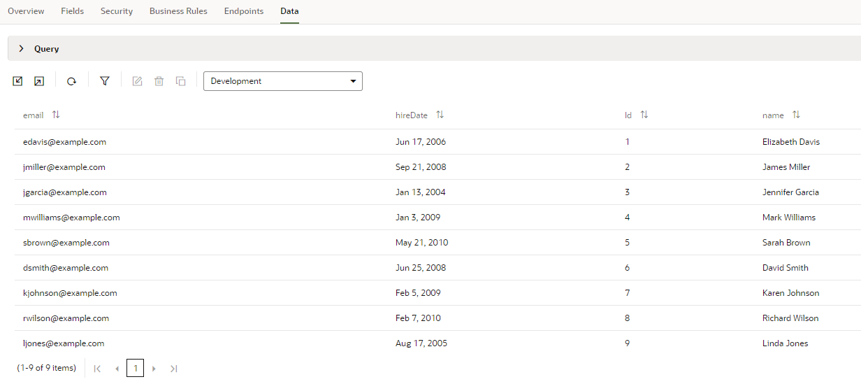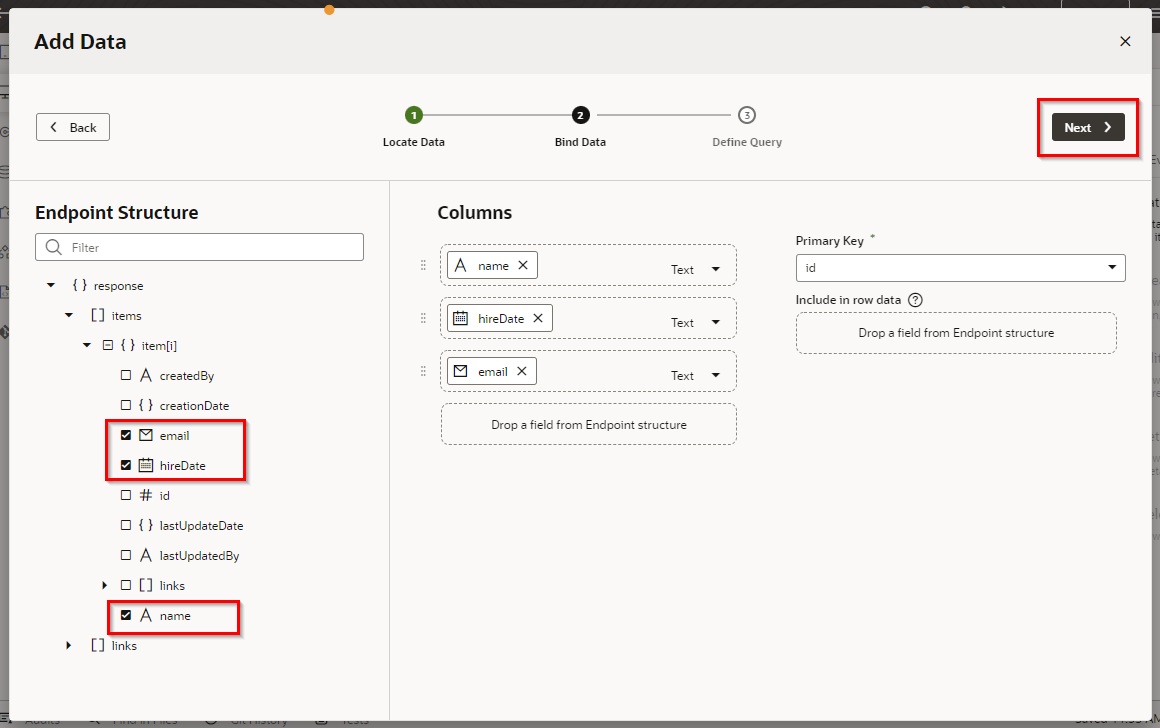 画面左の"Endpoint Structure"からname, hireDate, emailを選択し、“Next"をクリックします。