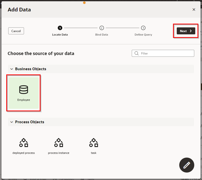 “Business Objects"で"Employee"を選択し、“Next"をクリックします。