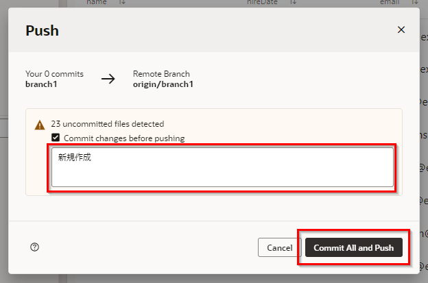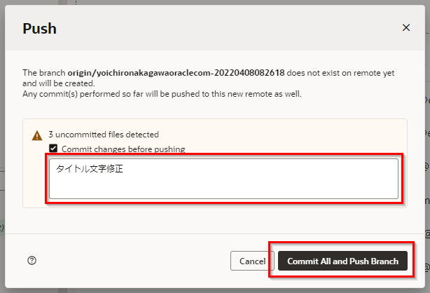 任意のコメントを入力し、“Commit All and Push Branch"をクリックします。