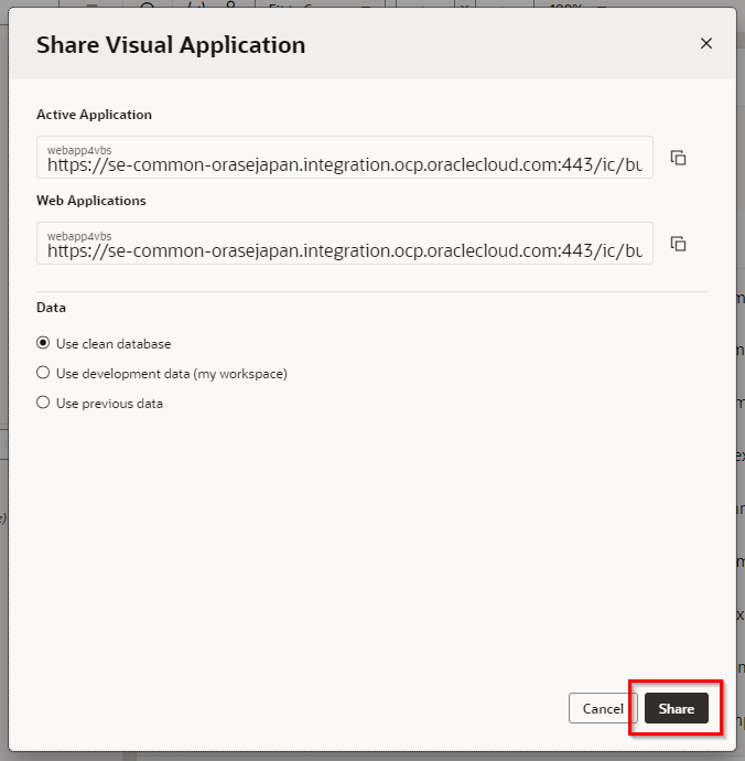 ダイアログが表示されます。 共有するアプリケーションのURLが表示されます。 今回はそのまま"Share"をクリックします。
