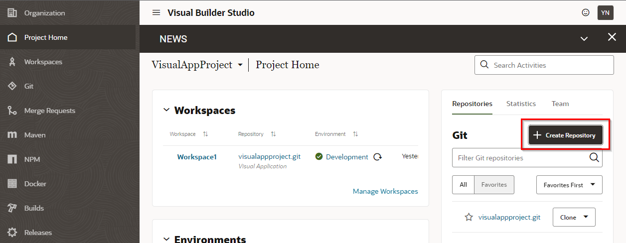 データファイルはアプリケーションコードの一部ではないため、このファイルを保存するための個別のGitレポジトリを作成します。Project Homeの画面で右側にある"Repositories"から"Create Repository"をクリックします。