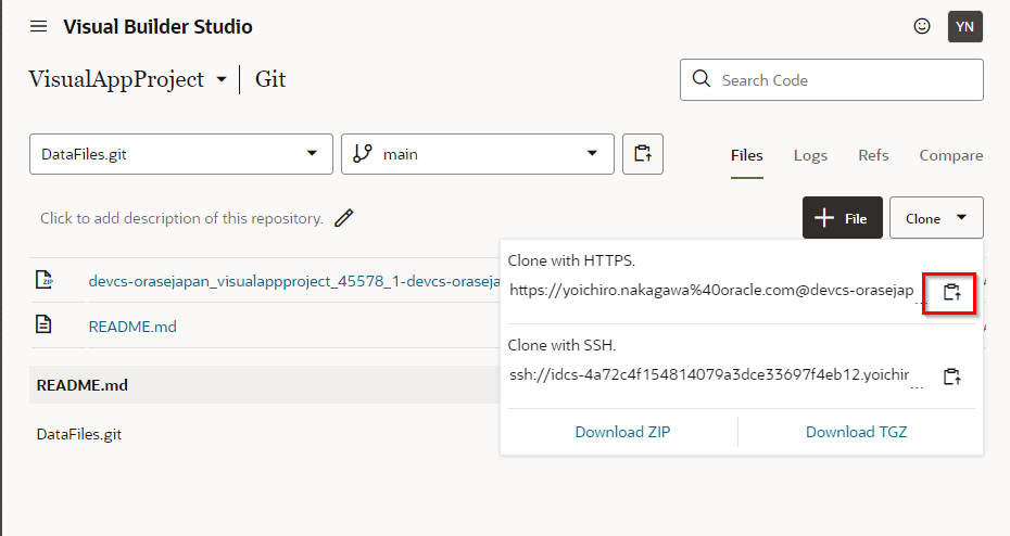次に、データファイルをそのレポジトリにロードします。 “Clone"をクリックし、コピーアイコンからレポジトリのURLを取得したら、任意のターミナルからGitコマンドを利用してデータファイルをレポジトリにプッシュします。