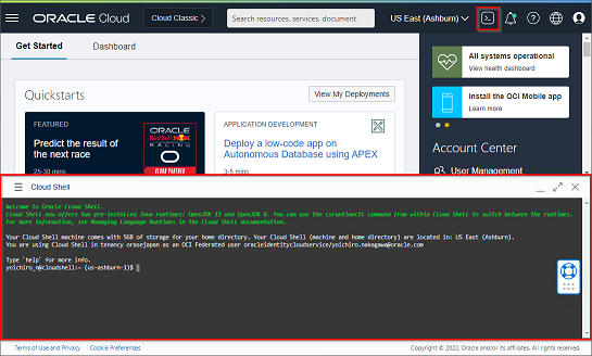 - OCIコンソールの右上にある “>_” アイコンからCloud Shellを起動する。