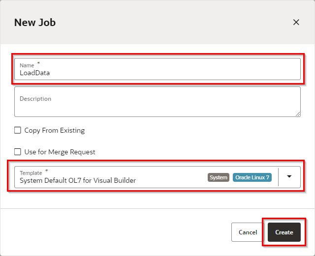 Name に “LoadData”, Template に任意の VMテンプレート(今回は"System Default OL7 for Visual Builder”)を選択し、“Create” をクリックします。