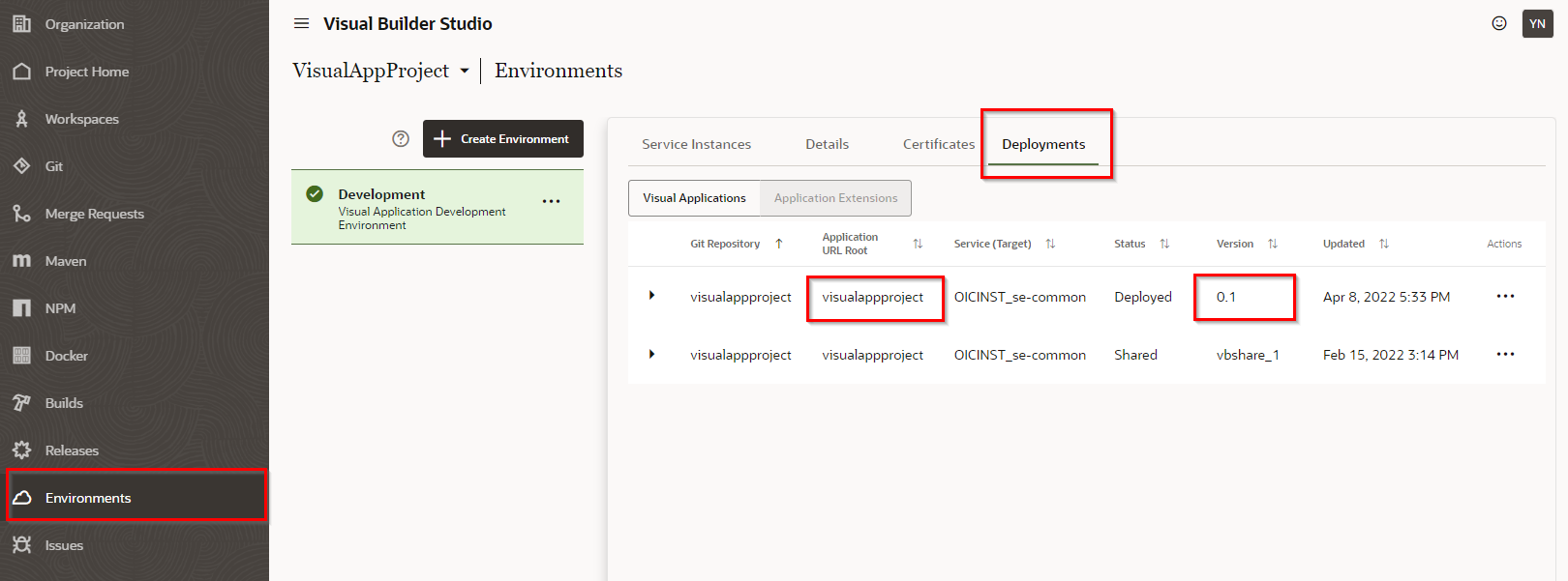 “Application URL Root”、“Application Version"に設定する値はVBSコンソールから"Environments”-“Deployments"タブから確認できます。
