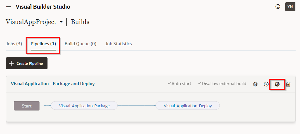 “Builds"画面から"Pipeline"タブを開き、設定アイコンをクリックします。