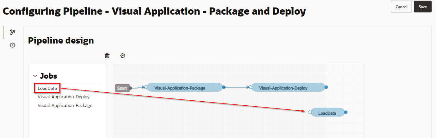 “Visual-Application-Deploy"と先ほど配置した"LoadData"をドラッグアンドドロップで結びつけ、“Save"をクリックします。